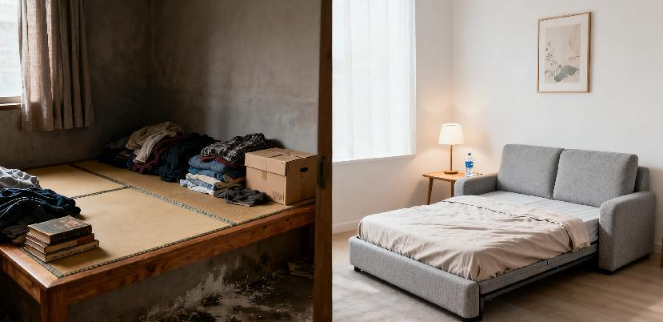 -小房间考虑使用沙发床或标准床+储物柜的组合,更灵活实用。