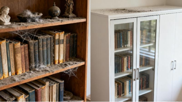 开放式书柜、红酒柜是灰尘收集的重灾区,时间久了连书页上都是灰尘,清洁费时费力。