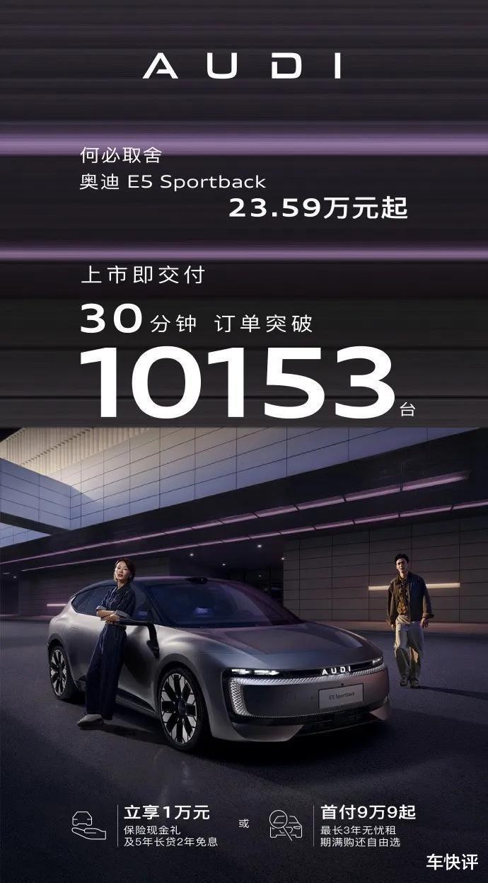 根据上汽奥迪官方公布的数据,9月16日上市的奥迪E5 Sportback半个小时大定就突破了10153辆。这样的订单量数据,如果放在造车新势力车企中基本上是没有炫耀的必要。但是作为一台合资品牌的新能源车,半个小时订单量能够突破万辆真的是挺牛。